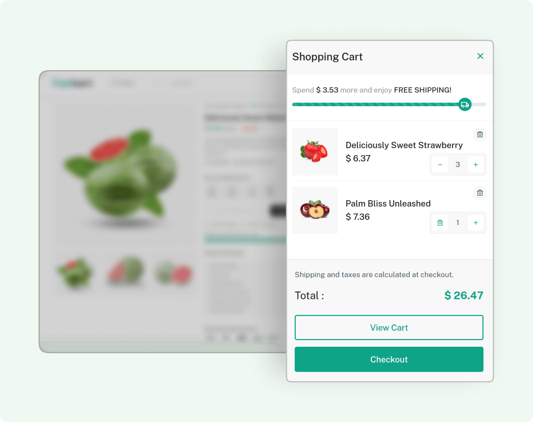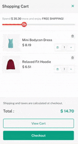 Fastkart offers two cart options: a sidebar and a mini cart. The sidebar has a free shipping processbar with a distinctive animation.